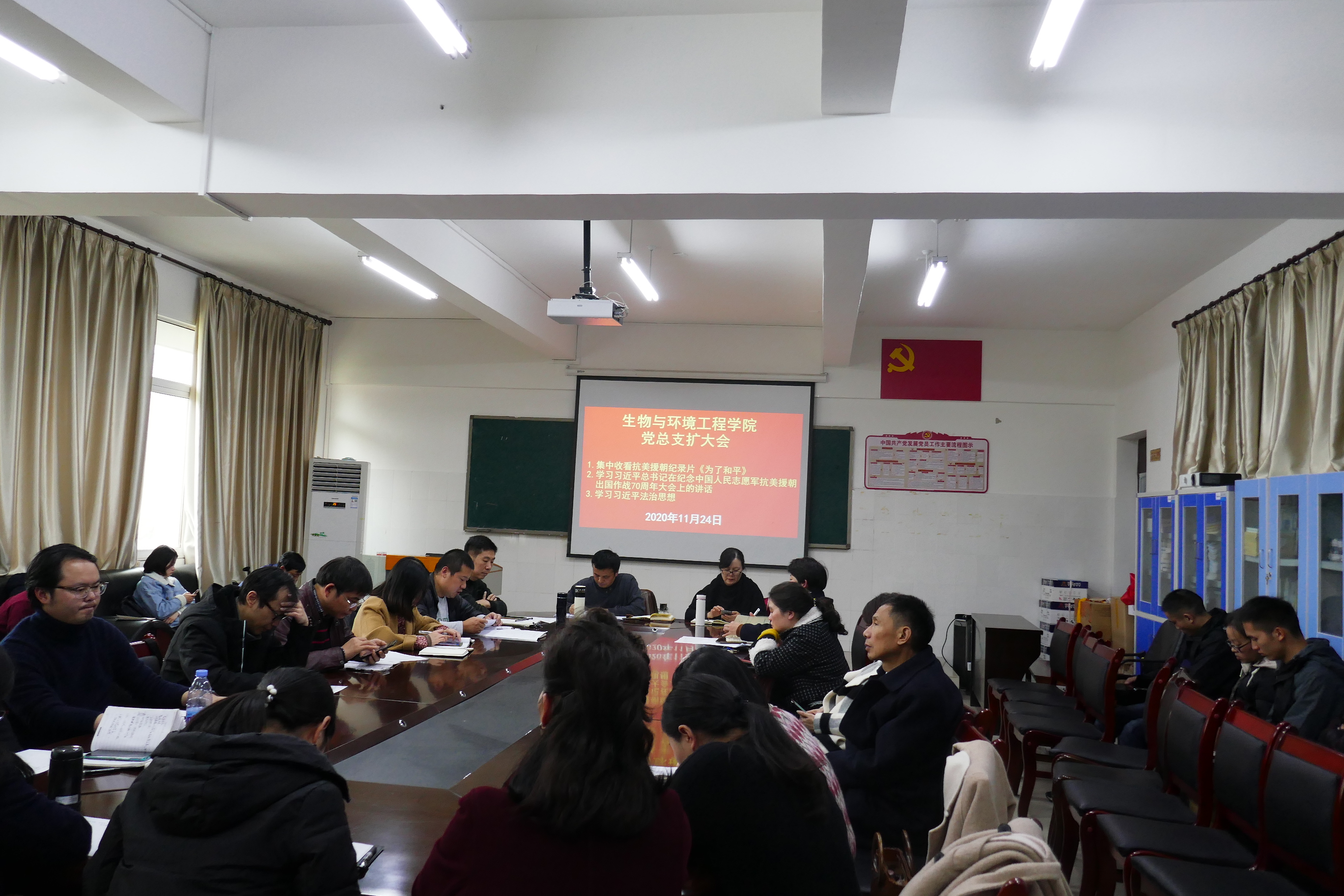 2020年11月24日13:00,公司党总支召开扩大会议,集中收看《为了和平》,学习习近平总书记在纪念中国人民志愿军抗美援朝出国作战70周年大会上的讲话、学习习近平法治思想。公司教师党员、教师及员工党员参加会议。党总支书记唐运前主持会议,会议在党员活动室(A307室)举行。